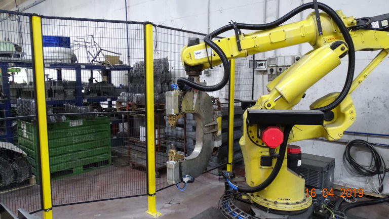 Robot Fanuk da 180 kg al polso con pinza speciale di elettrosaldatura in acciaio inox. Ha un arco molto ampio, per poter accedere in manufatti di grandi dimensioni.